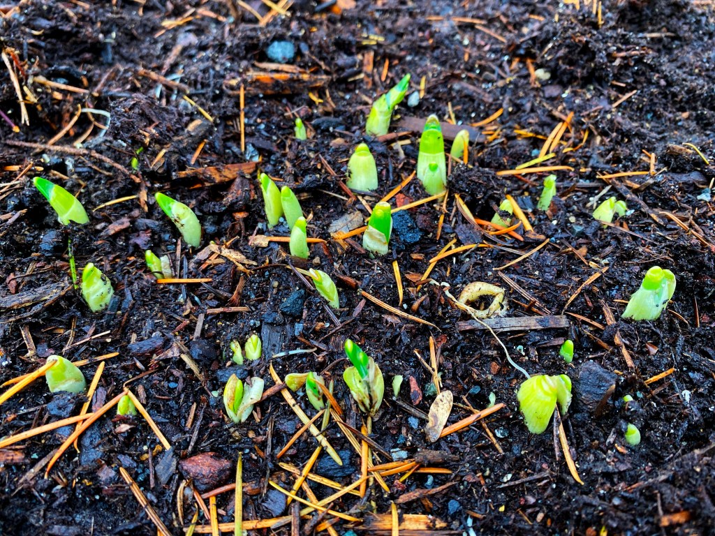 Plants wait for planting / watering can sits idle / cold Spring rain falling.