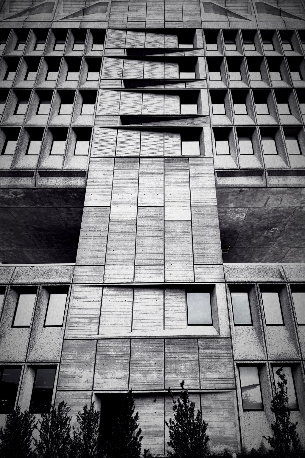 Forbidding facade / cold, cracking, crumbling concrete / grey, grim, glowering.