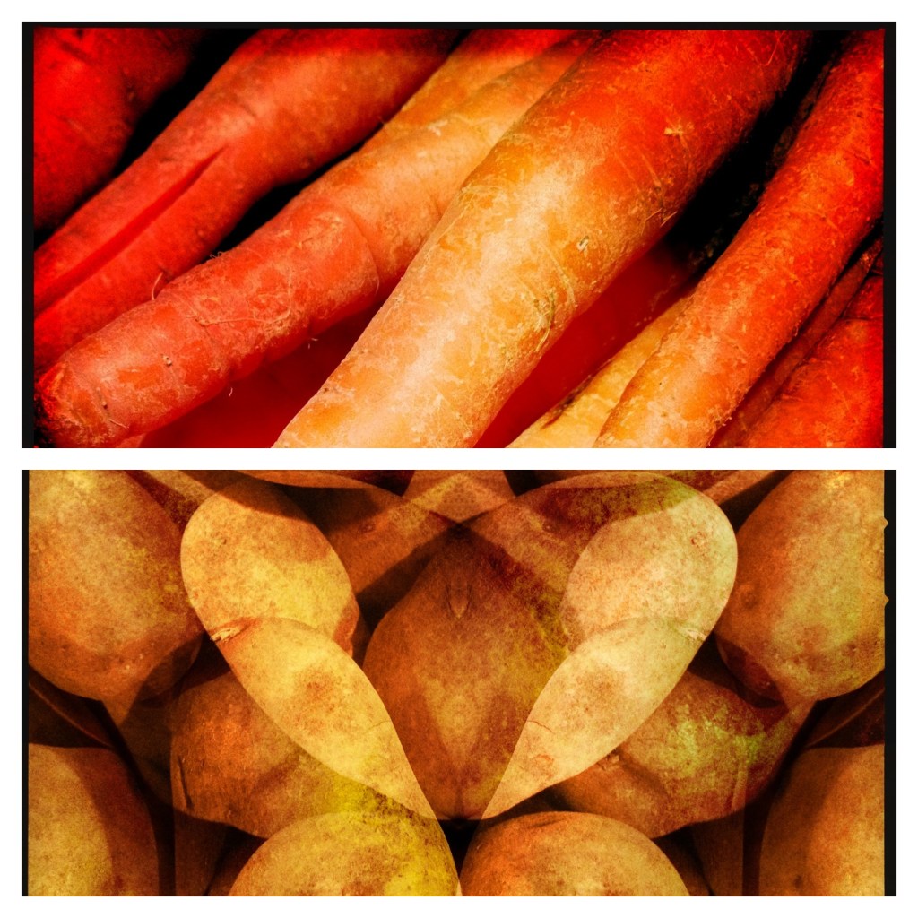 Potatoes, carrots / a pair of roots for paring / rarely paired with pear.