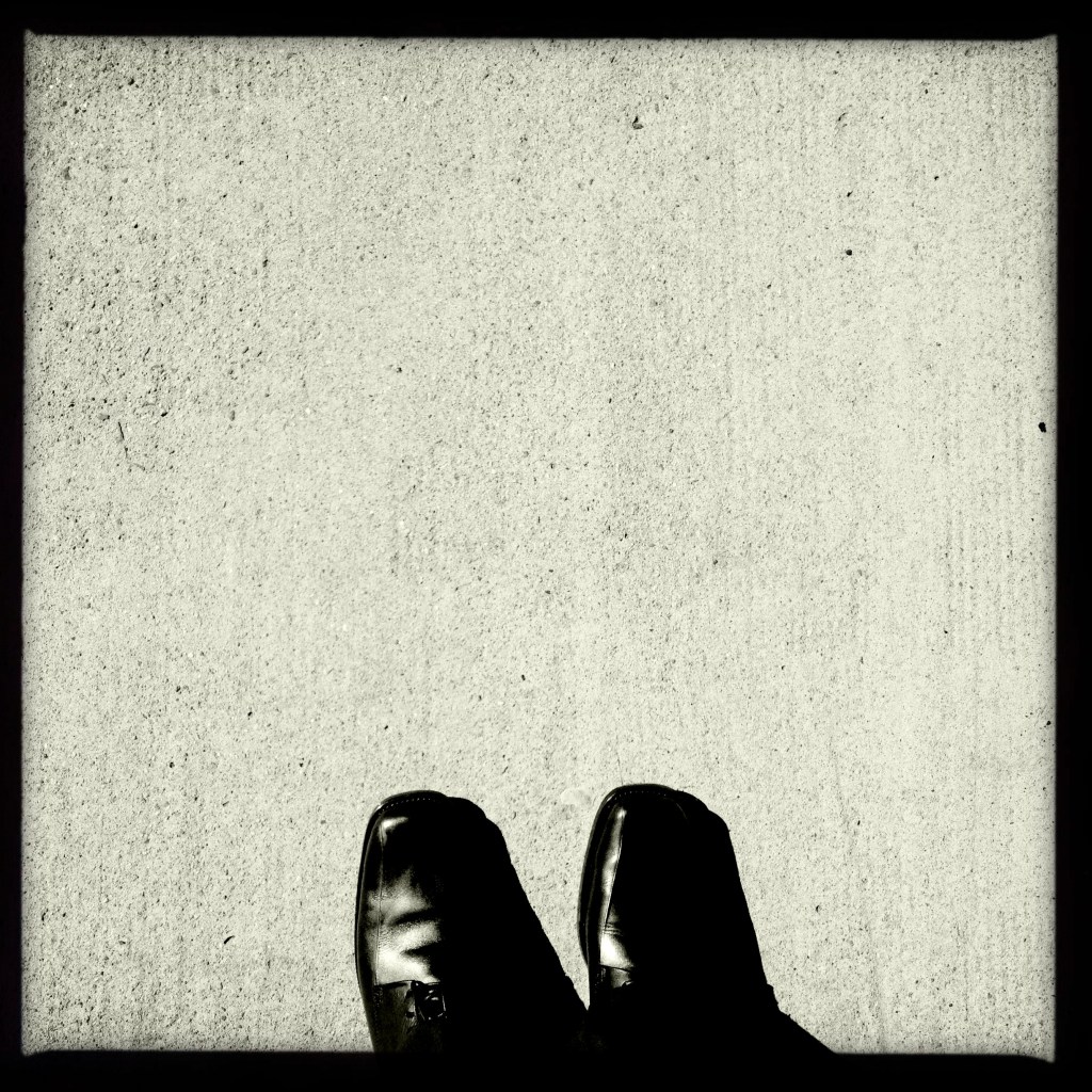 Black interview shoes / morning sun on train platform / both shine hopefully.