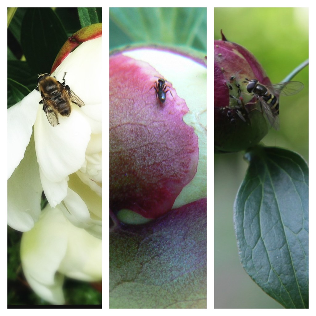 Thanks! the first is a bee for sure, the second is actually an ant (a little blurry – enlarged), and the third is some type of wasp (related to a yellow-jacket). There must be sweet nectar on those peony buds and flowers!