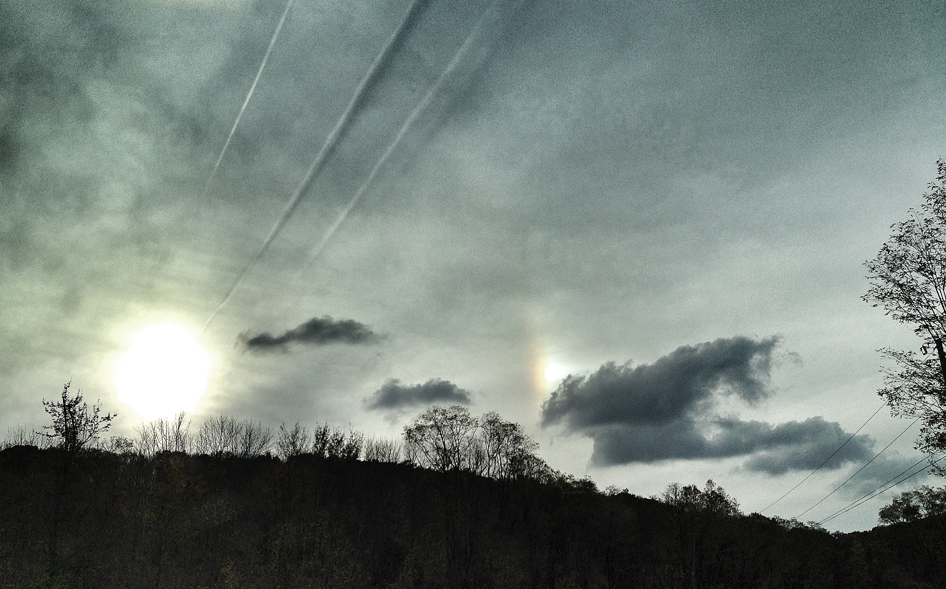 Strange heavens / moon dogs and horse clouds / dance, shining. Strange skies in advance of the hurricane’s arrival…hazy sun glowing, three jet trails like creases in the heavens, a prancing horse-cloud with a glowing tail – the moon, with a halo, shining brightly – a “moon dog” I’m told… Share this: Click to share on Pinterest (Opens in new window) Pinterest Click to share on Mastodon (Opens in new window) Mastodon Click to share on Bluesky (Opens in new window) Bluesky Click to share on Facebook (Opens in new window) Facebook Click to share on LinkedIn (Opens in new window) LinkedIn Click to share on Tumblr (Opens in new window) Tumblr Click to share on Threads (Opens in new window) Threads Click to share on X (Opens in new window) X More Click to share on Reddit (Opens in new window) Reddit Click to share on Pocket (Opens in new window) Pocket Click to email a link to a friend (Opens in new window) Email Click to print (Opens in new window) Print Like Loading... Related