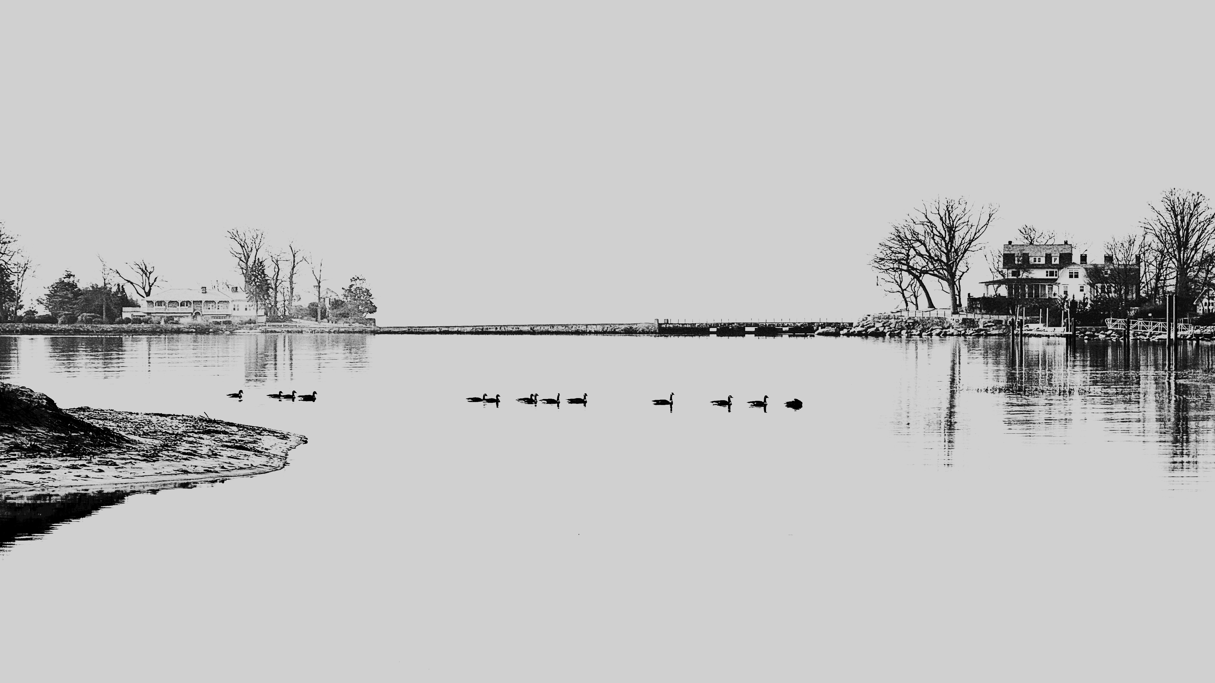 A misty morning / wayward winter waterfowl / lined up at high tide.