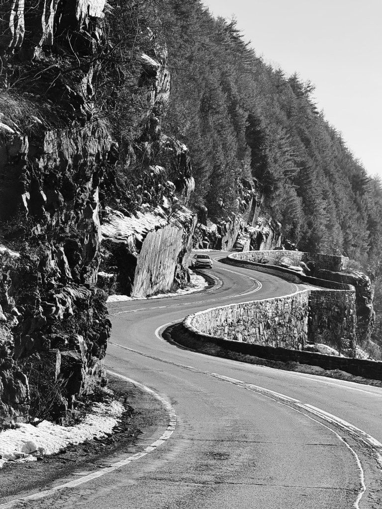 Texture of a cliff / beside curving road above / Delaware River.